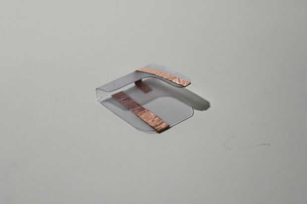 b. hacer una caja de la batería cubierta de una pieza de desecho plástico y adherir dos trozos de cinta conductora. Asegúrese de que uno de la cinta conductora se toque el terminal positivo y el otro será el terminal negativo de la batería. Se se sueldan los cables del auricular a estas cintas conductoras.