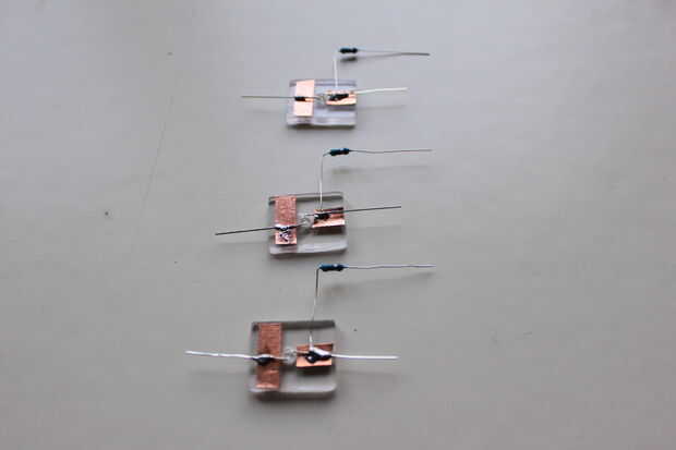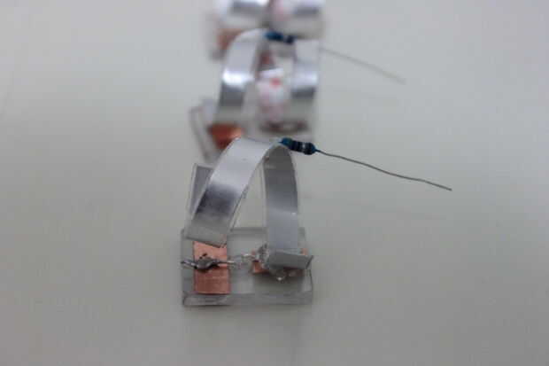 f. la soldadura de las patas del LED en las cintas conductoras.