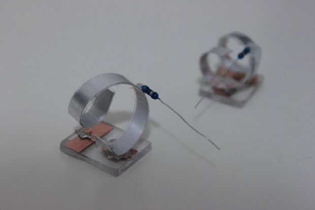En mi caso, usé un trozo de tira de aluminio en espiral alrededor de mi dedo para actuar como ambos un conductor de la ayuda actual y estructural negativa. Va a tocar la pierna del cátodo (-) del LED. Para la corriente positiva usé cinta conductora y una resistencia para conectar la pierna del ánodo (+) a la hebra positiva del auricular.