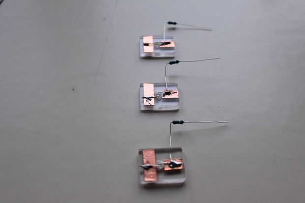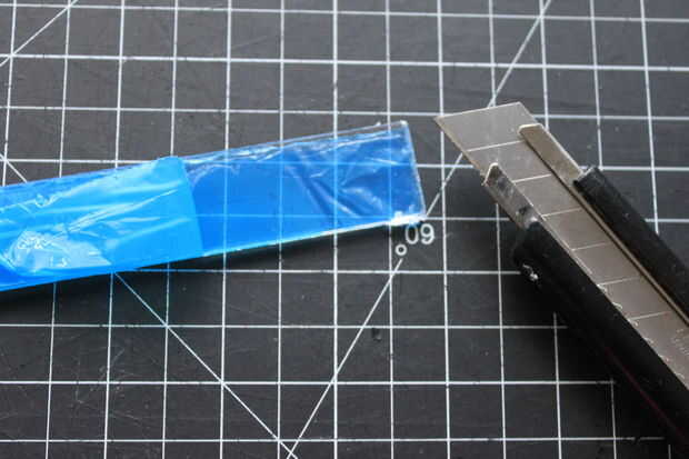 d. cinta dos trozos de cinta conductora a un lado del acrílico. (estos serán los contactos positivos y negativos)
