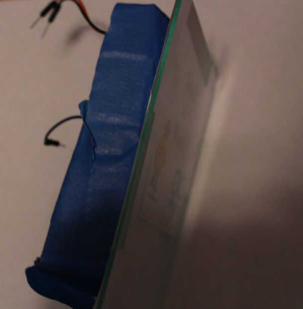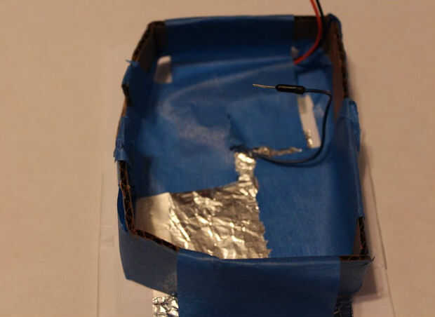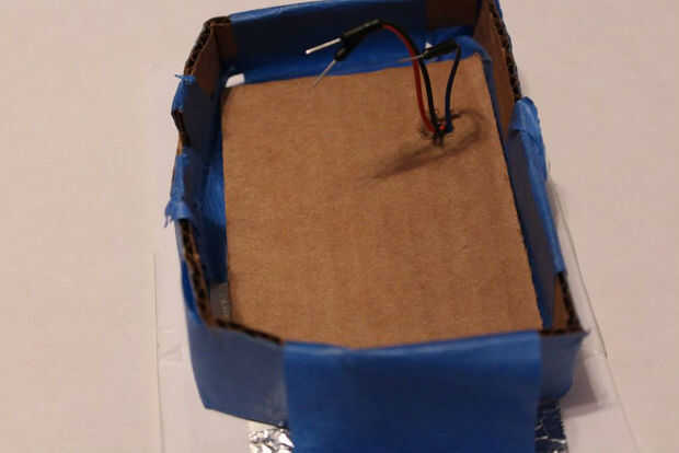 Ahora, tome su caja y ponerlo alrededor de la lámina en la parte posterior del vidrio. Fijarlo con pegamento o cinta. Ahora necesita un aislador para que el Arduino no corta. Tome un pedazo de cartón y cubierta de la hoja. Lo siento si esto era difícil de entender, pero ahora con la caja!