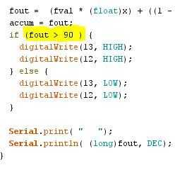Puede ajustar la sensibilidad del botón. Por defecto, solo tocas el botón. Se puede ajustar para que tenga lugar su mano entera en el botón o para que usted puede mueva la mano enfrente el botón. Para ajustar, abra al serial monitor (con el Arduino conectado). Usted debe ver números de desplazamiento hacia abajo en el monitor serie. Trate de tocarlo. Los valores aumentan mucho. Ahora trate de agitar delante de ella. Los valores aumentan al mover su mano más cerca. Coloque su mano cómo quieres que el botón activar. Registre el valor que se muestra mientras haces esto. Guardar ese número. Encontrar el valor de resaltado de la imagen de arriba en el código. Cambiar a 90 el valor registrado antes. Ahora, sube el código actualizado y ponga su mano en el mismo lugar. Debe activarse el botón.
