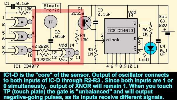 El circuito de interruptor Touch detecta tensiones vagabundas producidas por voltajes de las cañerías y la acumulación electrostática en una habitación. Son tacto dos placas y la resistencia del dedo cambia el voltaje en el pin 2 o 6 para cambiar el