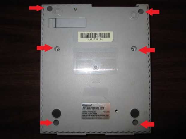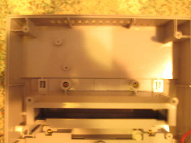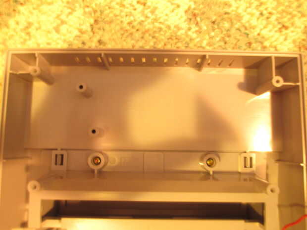 Cuando los tornillos están fuera, voltee la consola y saque la parte superior la mitad. Como se muestra en la segunda foto, son pequeños trozos de plástico que deben cortarse para hacer espacio para el arduino. No son partes esenciales del caso y se puede cortar sin dañar la integridad de la misma. Utilice una herramienta giratoria para cortarlos. Si no tienes uno usted puede probablemente corte les con cortadores de alambre.