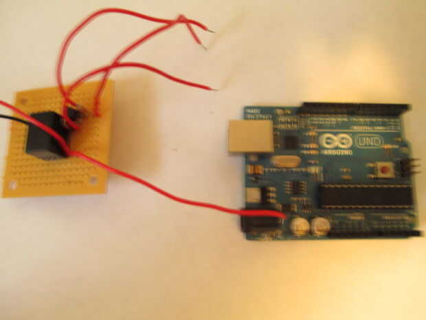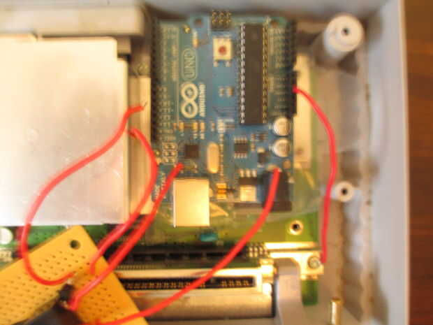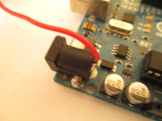 Luego de la soldadura del cable con la etiqueta "Arduino +" en el esquema en la parte posterior de la energía del enchufe en el arduino.
