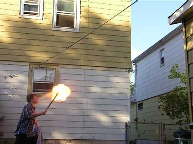 2. Mantenga la antorcha una caja de seguridad (por lo menos 2 pies) de distancia de su cara. (Como se puede ver en las fotos la llama viajó hacia mi boca de la antorcha, pero acabaron queroseno antes de que golpee mi cara)