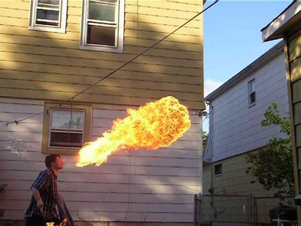 Ahora para obtener una explicación para esto. La razón que quiere sostener la antorcha lejos de su cara es para evitar un retroceso. Una vuelta de soplo es cuando la llama viaja a lo largo de la corriente llegando a la boca y quema la cara. Blowbacks pueden ser evitados en tres maneras