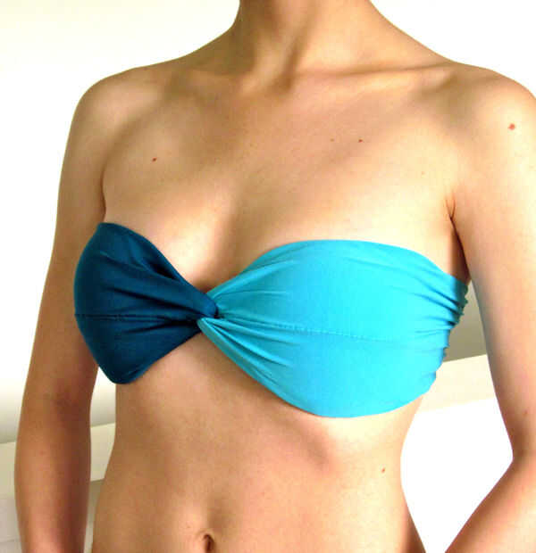 Este bikini bandeau auto alineado es super sencillo de hacer. Se hace solamente de 4 rectángulos y no utiliza a mucho la tela. Era capaz de hacer con 1/4 del medidor de cada color. Este bandeau fácilmente podría costar menos de $10, o incluso gratis, si tienes algún retazo colocación alrededor de!