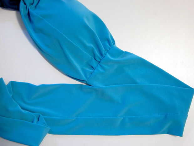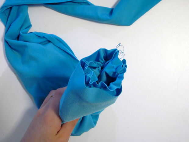 Cosas el frente del conjunto pieza en uno de los conductos de la pieza posterior y alinee uno de los bordes se reunieron con el borde de uno de los extremos del tubo. Coincidan con las costuras, pin y coser. Tire de la pieza frontal a través de al otro extremo del tubo. Esta debe girar todo el lado derecho hacia fuera. Hacer lo mismo con la segunda pieza posterior.