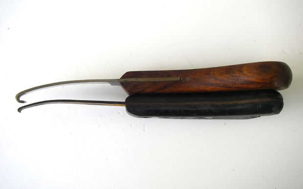 La punta del cuchillo del enganche es para limpieza de cascos de un caballo. La punta se ajusta a los contornos alrededor de la "rana", que es la parte viva de la parte inferior de la pezuña. Para tallar la madera no necesita tanto de una punta doblada.