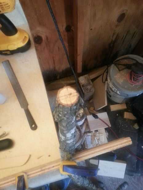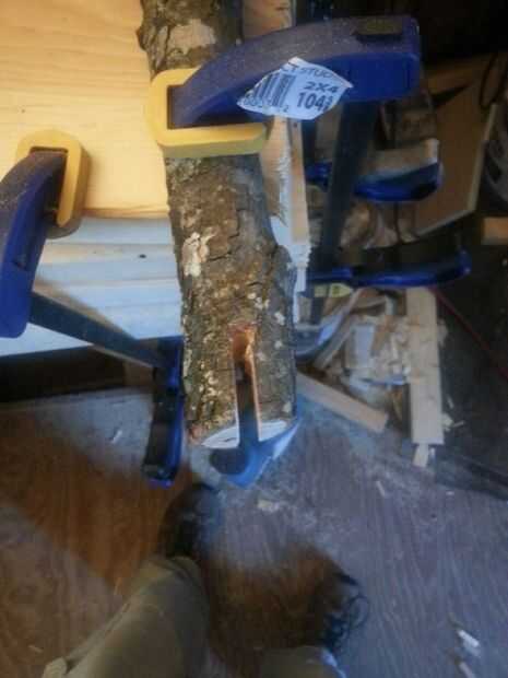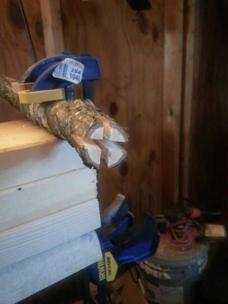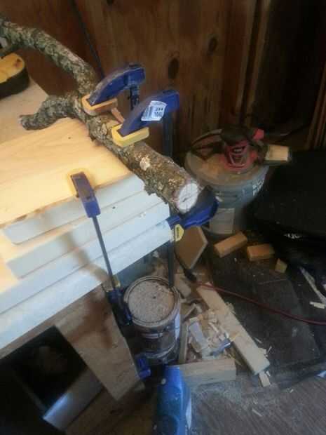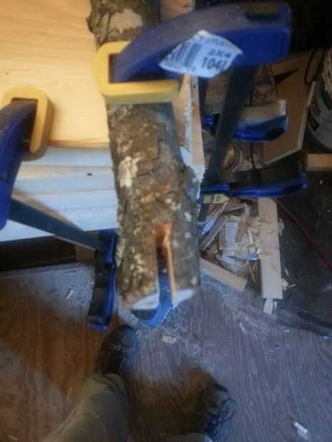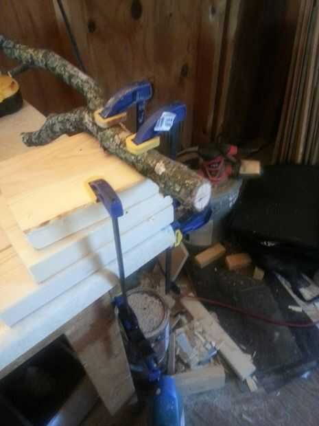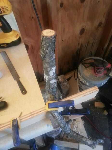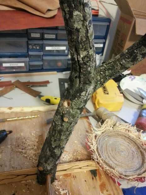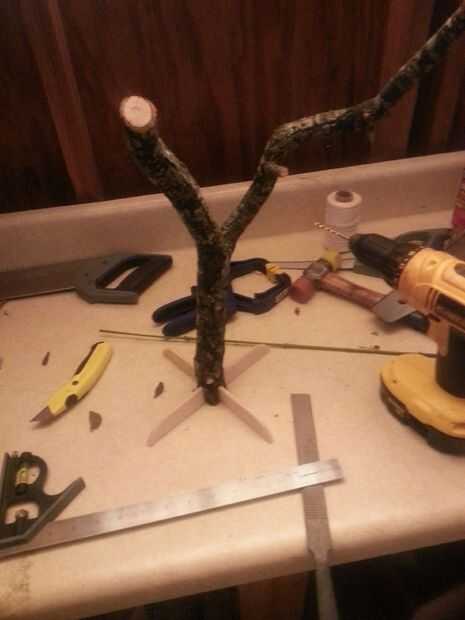 Después de que la rama era cortar a la longitud (~ 16") y recortar cortar una ranura en cruz fuera de la parte inferior de las patas de madera contrachapada. Usé un taladro para quitar los pedazos después de que los cortes se realizaron a ambos lados de la ranura y un raspador para limpiar para arriba. He añadido más almacenamiento de información de joyería al árbol por agujeros y colocar ramas poco robustos y sellado con pegamento de madera. Muescas en la parte superior de las ramas poco para evitar collares de agrupar para arriba y deslizar hasta la base.
