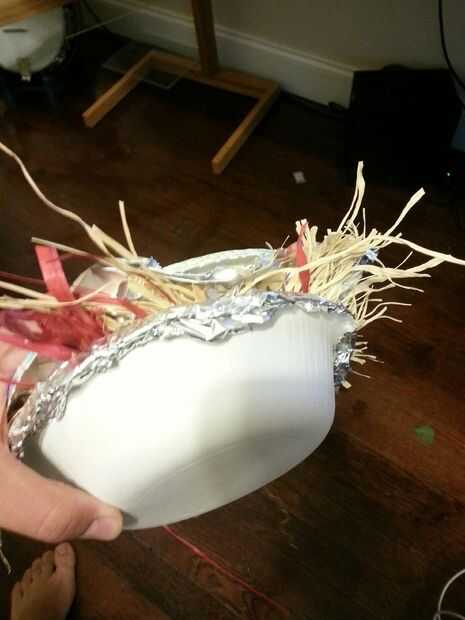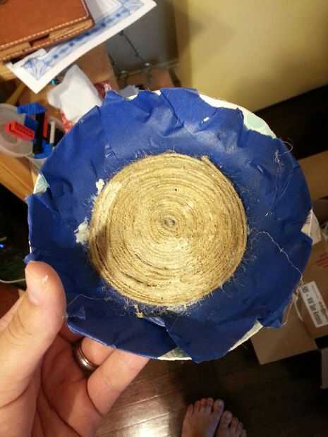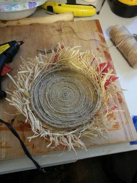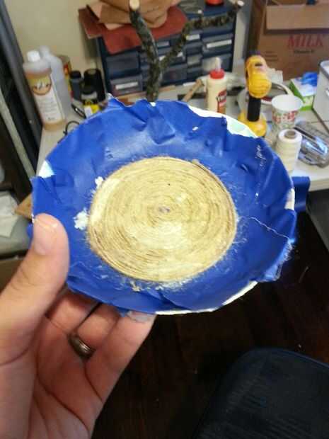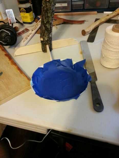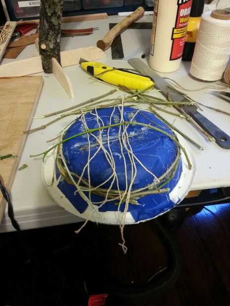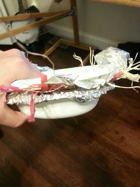 Esta fue la parte más delicada del proceso y tomó más tiempo (ambos en construcción real y tiempo de secado). Mi primer intento fue a pegar ramitas y cordel alrededor de una taza. Esto fue muy educativo pero sin éxito. Mi segundo intento fue a la línea de un recipiente con papel de aluminio, cubrir el fondo en pegamento de madera, colocar una estera de rafia y luego coloque otro tazón de fuente cubierta de papel de estaño en la parte superior para completar el molde. He puesto bloques de madera en el recipiente superior para permitir la colocación de las abrazaderas que junte la rafia.