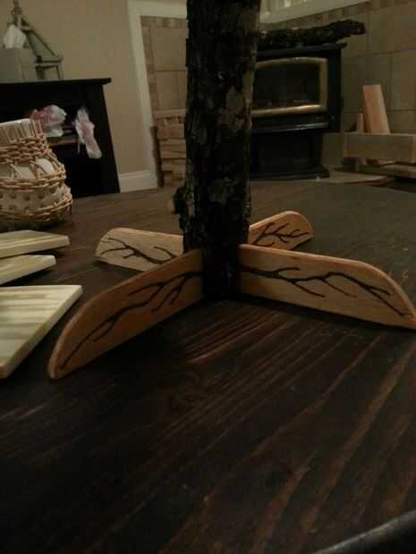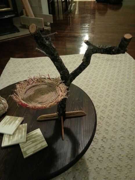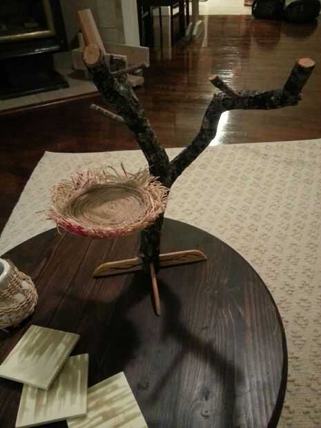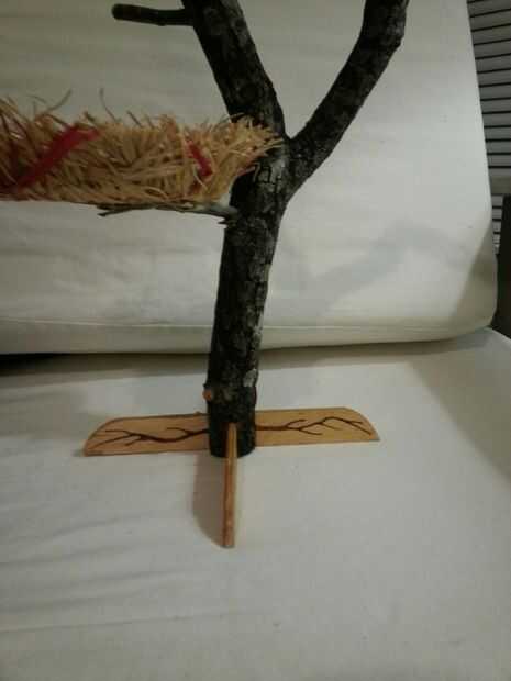 Una ramita en forma de Y colocada hasta la mitad del tronco era el perfecto descanso para el nido que se lleva a cabo con pegamento caliente. Una capa final de mancha a los extremos de las ramas y se hizo!