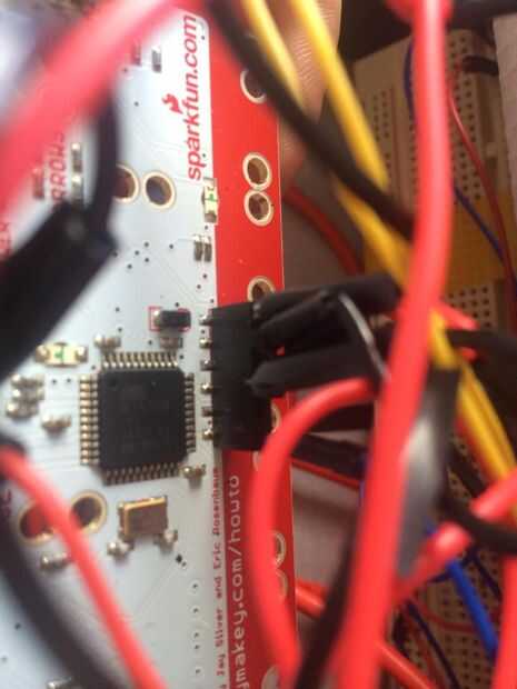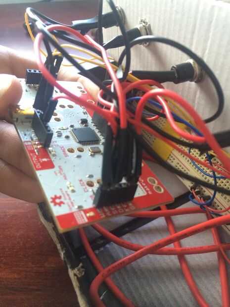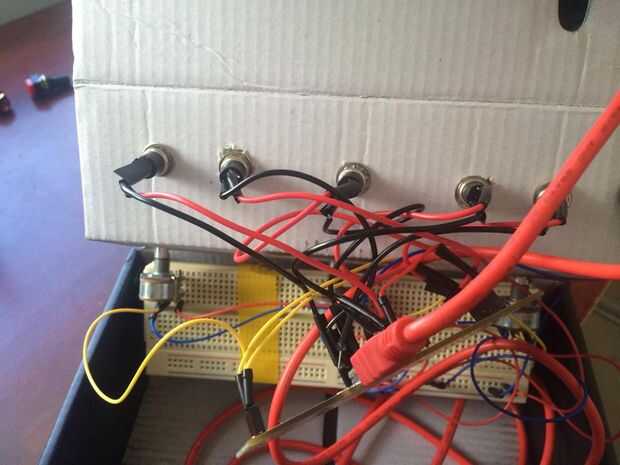 El botones tuvieron que renunciar el uso de la placa y conecte directamente a Makey Makey debido al mayor número de entradas digitales se utiliza (cables rojo pin). Las entradas negras fueron enchufadas en los puertos de la tierra en el Makey Makey. Los botones fueron a través de los agujeros en la parte superior de la caja que se celebrará en el lugar.