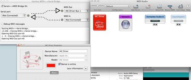 Mientras las pulsaciones de teclas provocados por los botones se pueden utilizar sin otros programas, los mensajes Midi necesitan un puente. En opciones de Audio Midi, el conductor del autobús IAC debe estar activado para actuar como el autobús entre programas. Luego se debe abrir Midi sin pelo, seleccionando la Junta anteriormente mencionada (seleccionados en Arduino) y enviarlo al conductor del autobús IAC. Una vez que se ha establecido se envían mensajes Midi, el Midi en Ableton debe establecerse en el controlador de bus IAC. Una vez completa, mensajes Midi pueden ser enviados a través de y asignados, concluyendo el sistema para arriba para el instrumento electrónico.