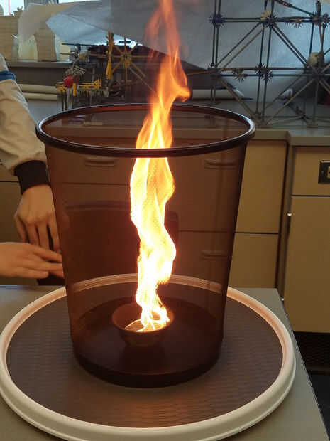 idea de este Tornado de fuego pretende hacer un vórtice del tornado de aire impulsado y visualizado por el humo y el fuego. La corriente aérea ascendente que sostiene el vórtice es creada por el aire caliente del fuego (el fuego crea su propio tiempo