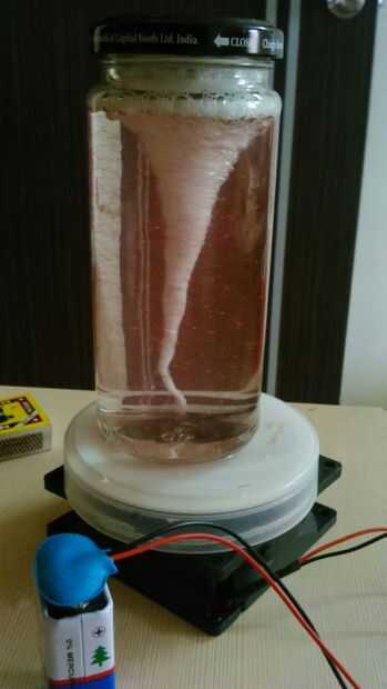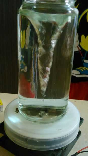 He utilizado botellas de encurtidos y aceitunas, que no tiene fondo plano. el agitador rebota dentro del frasco y el tornado es asesinado.