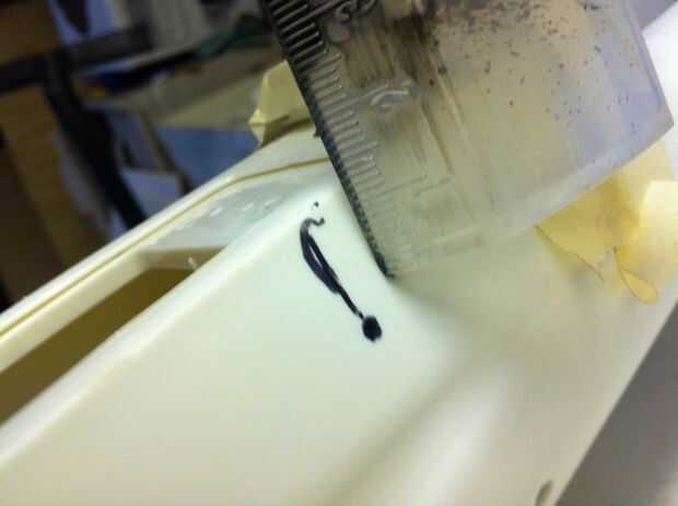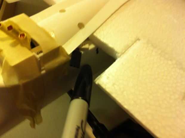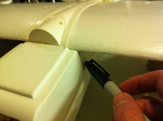 Muy simple, sólo poner el ala en el fuselaje y marcar el frente y atrás. Luego marca el agujero de taladro a una distancia uniforme por debajo de los primeros agujeros. Elegir 1,5 cm. Nota: algunos cuerpos no puede tener una superficie superior plana, tome esto en consideración cuando marcar agujeros. Mina por ejemplo tenía un aumento de .5cm. Así dos agujeros eran 1,5 cm y los otros dos eran 2cm.