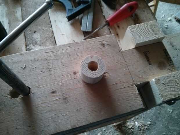 Usted necesitará crear a un espaciador para el tornillo. Utiliza mi Serrucho y cortar un disco de 2" de un 2 x 4", luego perforar el agujero de centro hacia fuera para el diámetro del tornillo de mi. Usted puede hacer tantas de estas como quieras, dependiendo del espacio que desea para la ' t ' de su tornillo. Una buena sugerencia sería hacer dos de estos discos, cortan un canal pequeño a través de la superficie de uno para la ' t ' en. Luego puede aplicar un poco de aceite de almendra entre los dos separadores y crear un sistema de buje lubricado que podrás apretar la abrazadera más suavemente.