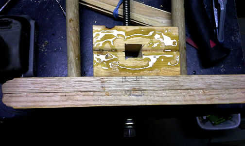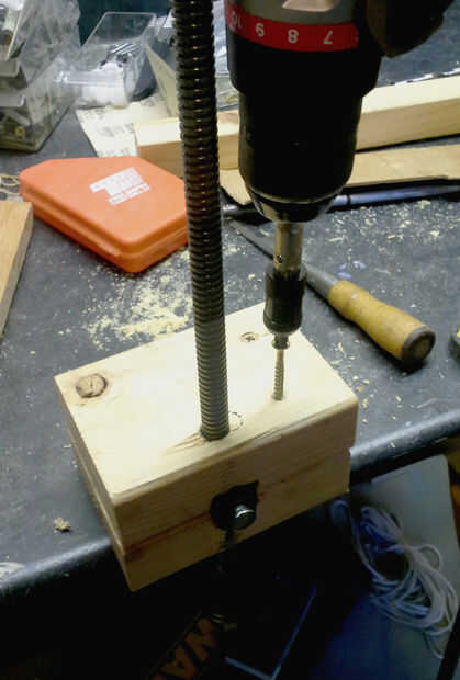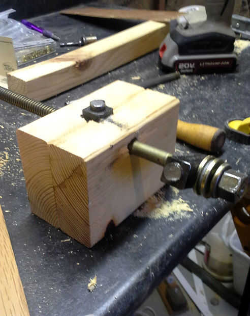 Después de cortar una ranura para recibir la barra roscada (el que corte de la tijera jasck), encolar y atornillar los dos 2x4s por todos lados para hacer un bloque muy sólido.