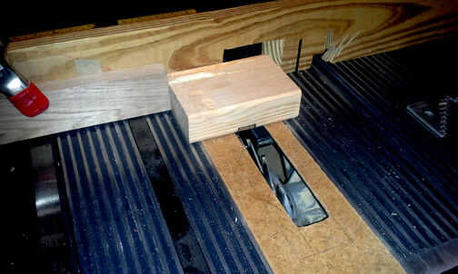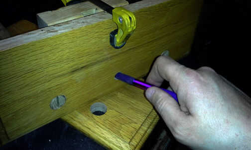 Este bloque va a fijarse en el bajo el lado de su mesa de trabajo detrás de la cara del tornillo montado. La varilla roscada debe viajar a través de él a la misma distancia por debajo de la superficie de trabajo como sus caras de tornillo de banco. Atornillado y pegado en la cara montada para que la parte superior fue al ras con la superficie de trabajo. Que verás en el siguiente paso. Entonces sostuve este bloque hasta que es lateral y marcadas a través del orificio de la varilla donde viajará la varilla a través del bloque.