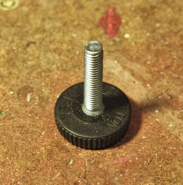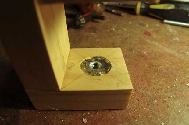 Para el tornillo de ajuste inferior he utilizado algo que se llama una "pata ajustable" (primera foto). Creo que se utiliza en la parte inferior de las patas para ajustar la altura de la pierna, pero he encontrado muy útil como una perilla de ajuste para otros fines. Los que compraron tienen una parte roscada 6 mm x 30 mm, que funciona muy bien con la estantería de pino de 18mm que uso para muchos de mis proyectos. Para colocar el tornillo, usé un tornillo, tratado con una cucharada de pegamento de contacto antes de presionar en su lugar. Primero perforaron un agujero de 8mm para el vástago de la tuerca de T y rebajar la parte superior de la tuerca con una broca de pala de 19mm (segunda foto).