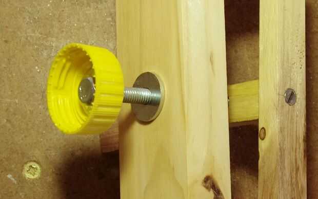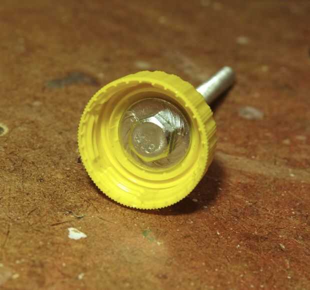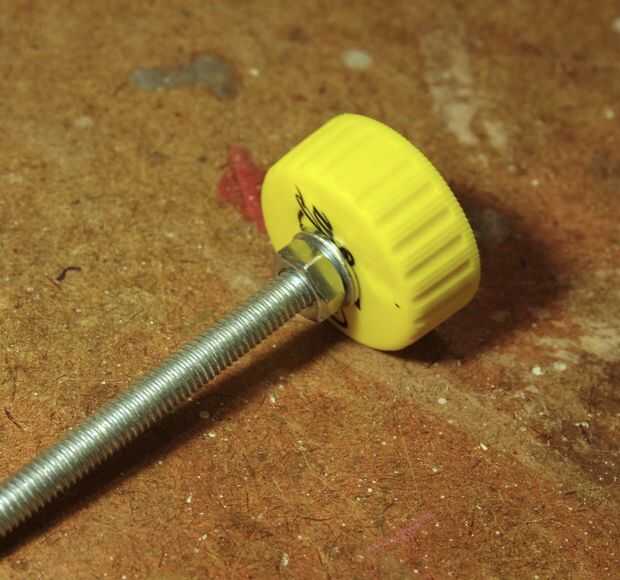 El tornillo de ajuste más importantes es el perno de apertura y cierre de las mordazas de la prensa. Un perno de 6mm, 75mm de largo, funcionó a la perfección. La perilla de que pasado de moda de una tapa plástica de la botella de coca cola. Primero perforé un agujero de 6mm a través del centro de la tapa, a través del cual empuja el perno, provisto de arandelas en ambos lados de la tapa. Una tuerca de fijación mantiene todo en su lugar (tercera y cuarta fotos). Mi versión de una contratuerca es justo dañar las roscas del perno con un punzón para mantener una tuerca normal firmemente en su lugar.