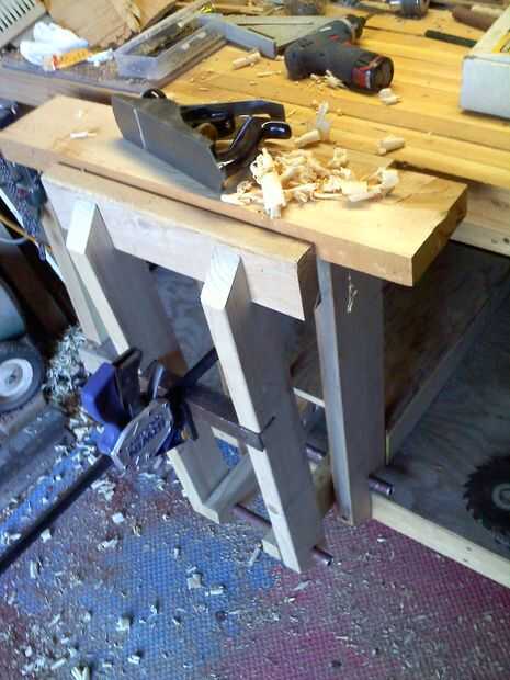 Este tornillo de banco – a veces llamado tornillo de Moxon – es barato de hacer, portable y funciona muy bien para sostener las piezas de trabajo mientras aserrado, cincelado o cepillado. Hay muchos diseños para este tornillo en Internet; Te voy a mo