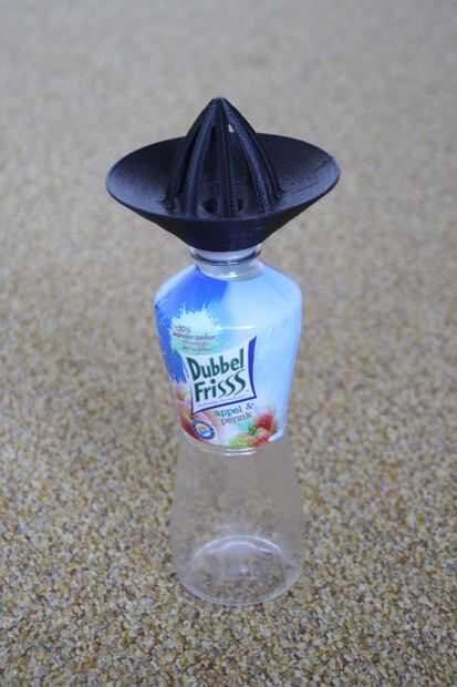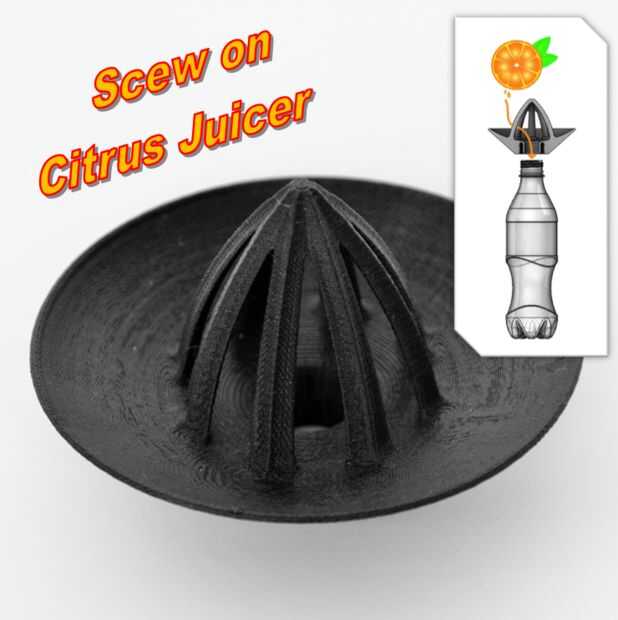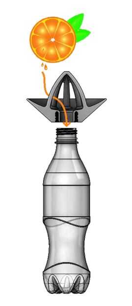 La idea nació! Tomar un exprimidor de cítricos regular y modificar por lo que cabe en una botella y el jugo fluye automáticamente dentro de la botella. Haciendo esto puede servir la bebida muy fácil o tomar en cualquier lugar que desee!