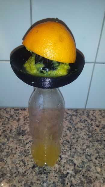 El diseño salió gran. La rosca grande montado en la botella de plástico y el jugo fluía muy bien en la botella. Pero después de jugo un par de naranjas me di cuenta de que la pulpa no fluya correctamente. Esto provocó algún bloqueo y el jugo no podría fluir a través de ya.