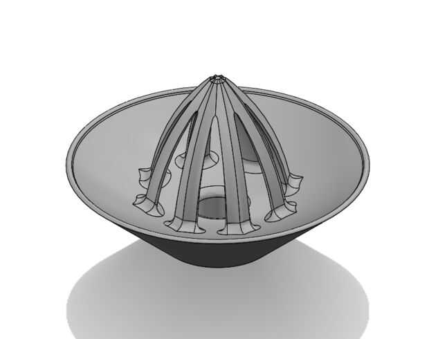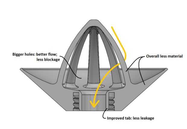 Había abordado el problema de la pulpa, bloqueando el flujo haciendo no sólo los agujeros más amplio pero también más alto. Este mend que cuando algunos de la pulpa se atranca el jugo podría fluir sobre él de todos modos. Esto también hizo el diseño menos voluminosos y había no más puentes en los agujeros, que es muy útil cuando la impresión 3D. También me gustó el aspecto general mejor.