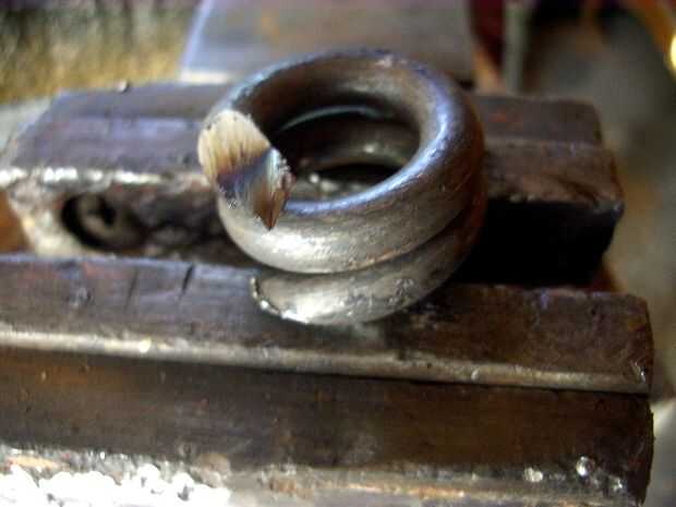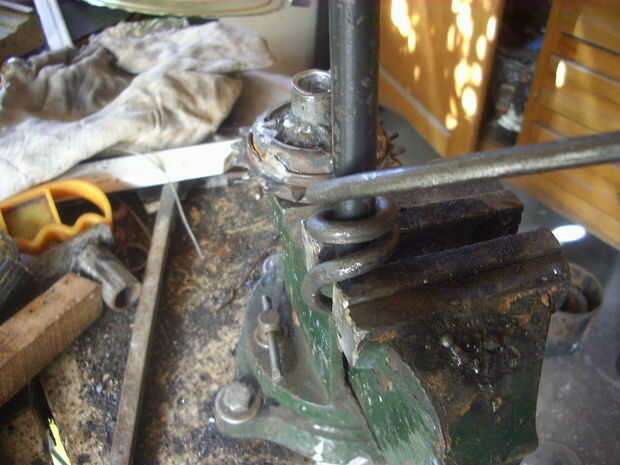 En frío del hierro de 8 mm en otro pedazo de hierro, 12 mm de diámetro. En la primera etapa que no me importo para retener el paso correcto, lo hice una vez que había creado dos vueltas de lo que sería el "hilo" del tornillo. Como corazón de esta usé un pedazo de coche de dirección, también descartado por agotamiento. Firmemente montado en dos vueltas de alambre en este eje de 8 mm, aproximadamente 13 mm de diámetro. Separa las bobinas por un cincel utilizado como una cuña, en el sentido de que la separación entre vueltas coincide con la distancia entre los dientes del engranaje. Según mis observaciones, con una vuelta y unos milímetros sería suficiente, pero me decidí a hacer algo más de dos vueltas, para que la fuerza siendo distribuido sobre dos ruedas dentadas. Creo que fue una buena decisión.