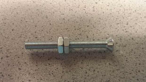 Uno de los otros pernos solía para medir cuánto poner la tuerca, es necesario ajustar en el Monte, que originalmente iba a usar dos tuercas para mantenerlos en su lugar pero más tarde decidió que sería mejor utilizar Sugru alguna epóxico.