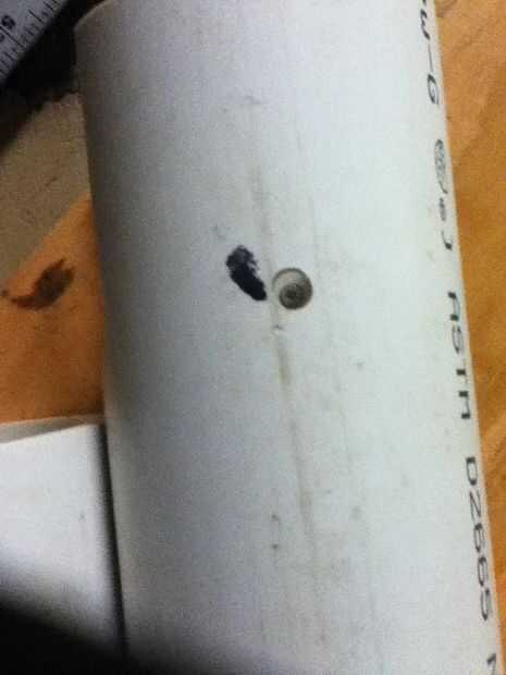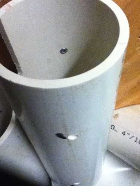 En 90 grados de Ángeles las muescas se perforó un agujero con un poco de avellanado de tornillo para madera de #6. Un conjunto de agujeros perforó hacia fuera más grande para dar cabida a un destornillador para pasar en el tubo de montaje.