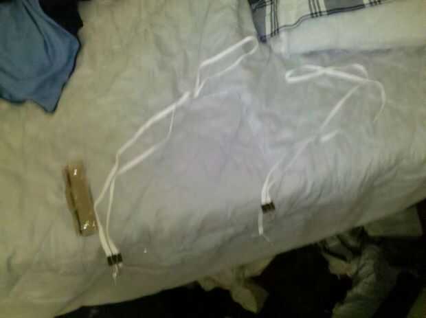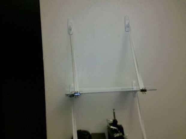 Después de que usted espere 1 hora para el pegamento en los ganchos para curar, utilizar una pinza de clip binder cada cordón a un borde del portapapeles, cerca de la esquina. Si se hace correctamente, el cordón va a crear un bucle, como se muestra en las fotos. Coloque el otro borde en los inferiores 2 ganchos y fije el lazo de cada cuerda para los ganchos superiores. Acortar por los cordones hasta que la junta esté nivelada. Si se hace correctamente, usted tendrá un estante puente levadizo-como que puede llevar a cabo... nada todavía. En este punto, no prueba su estante, o el peso puede hacer que los clips de la carpeta sacar.