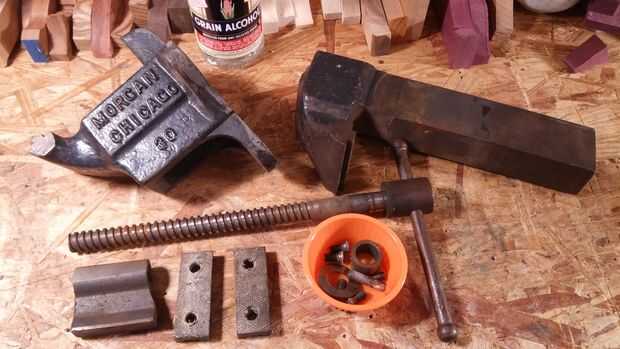 Hace varios años heredé 2 prensas de banco antiguo de mi abuelo. Estas prensas habían sido almacenadas en una caja de hielo hasta ahora en un esfuerzo para evitar cualquier deterioro. La a restaurar aquí es un amanecer 4" tornillo de banco que fue co