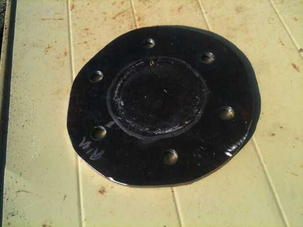 Salió que un 8 en chapa de acero cuadrado sería lo suficientemente grande para la placa base (maltratados a mina circular porque encontré un retal que tenía un semicírculo ya cortado).