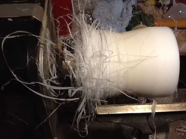 Tómese su tiempo aquí... Durante el corte usted conseguirá una buena cinta tiro hacia su hombro. Esta cinta es el único filamento continuo si tiene en sus manos la herramienta correctamente y aguda. Esto es lo que quieres, una larga cinta como filamento. pero ten cuidado. que una cinta larga continua rápidamente enganchar y tirar cada bit de la cinta hacia atrás alrededor de la pieza de trabajo haciendo un lío buscando nido de pájaros envuelto apretadamente alrededor de la mitad. así que parar y quitar este material a menudo de su banco de trabajo y área. Recogerá lo!!!