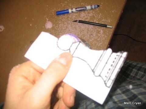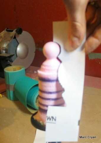 En este paso usaremos un cuchillo del exacto pequeño y una lija fina como las herramientas de corte primario. Cuando corte de piezas de ajedrez, el diseño puede dividirse en partes del cuerpo. -Cabeza, hombro, cintura, pies. Es más segura iniciar con la característica más alejado de la placa frontal y trabaje su manera abajo. Así que vamos a empezar ingenio la cabeza. Los pasos son: