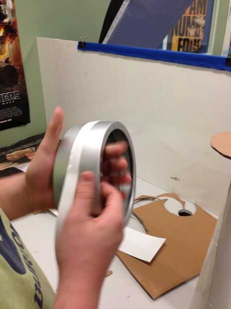 Poner el círculo de cartón entre las espaldas de dos reloj y poner cinta alrededor de él sellado