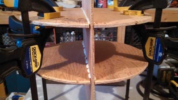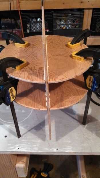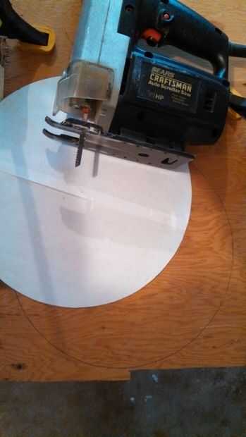 Primero planeo el tamaño que desea hacerlo. Hice mía con una dimensiones de 14 pulgadas de ancho y 16 pulgadas de alto. Hice un patrón para los discos (necesita 4 de ellos si quieres 3 estantes) todos el mismo tamaño, un círculo de 11 pulgadas. (usted puede hacer esto con un lápiz y una picadura si no tienes una brújula. Próximo 4 de ellas con un jig de Sierra de madera contrachapada de 1/4 de pulgada (Foto 2). Entonces usted necesitará realizar el soporte que va hacia arriba y hacia abajo entre los discos. El mio es un rectángulo - 11 pulgadas por 13.5 (eso es porque los lados, que recorren la parte posterior son de 14 pulgadas de largo, pero esto tendrá los discos superior e inferior, pegados a él lo que es de 14 pulgadas de alto). Usted tendrá que cortar una ranura en esta para los dos estantes y una ranura en dos de los estantes (discos) de modo que encajan entre sí (Foto 3). Esto hice este tamaño debido a la altura de los Skylanders, e hice el estante inferior lo suficientemente grande para los gigantes. Recuerde que la parte superior e inferior los discos sólo se pegan encendido, así que no hay ranuras. Ahora yo le pegue los dos estantes a la Junta de centro (como en la foto #3). A continuación tendremos que jugar con los lados.