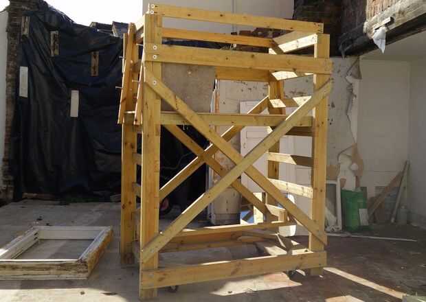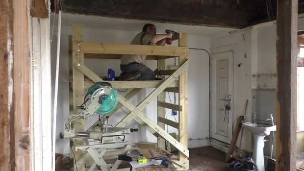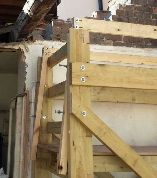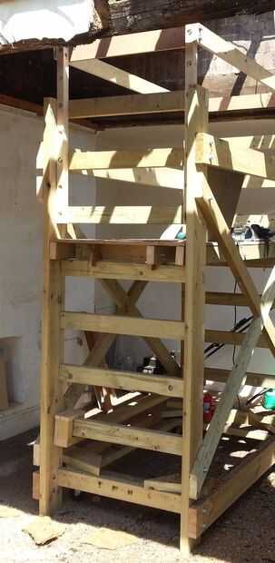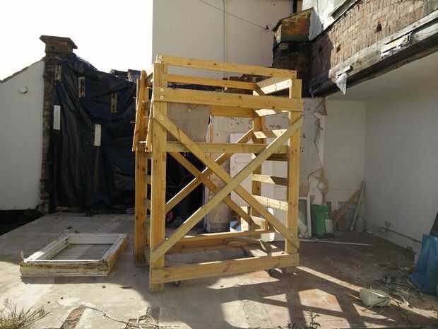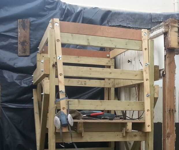 En una foto puede ver el Guardarraíl y la demolición parcialmente completa. Tengo la plataforma abajo un peldaño de la altura normal de trabajo y barandillas están abajo dos agujeros de su altura completa poniendo el carril a aproximadamente 1m por encima de la plataforma. Estuve trabajando derecho para arriba en el punto más bajo de la echada aquí la razón por la cual todo fue fijado más bajo de lo habitual.