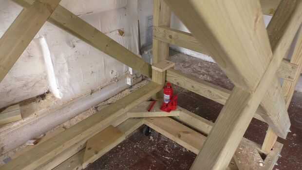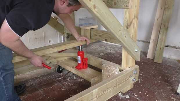 Un momento de buen pensar es la madera que capta el rayo elevación un poco más alto que se necesitaba. Lo que esto hace es permitir que usted presione en la viga de elevación, una vez que el andamio esté apoyada sobre las cuñas para liberar a la toma.