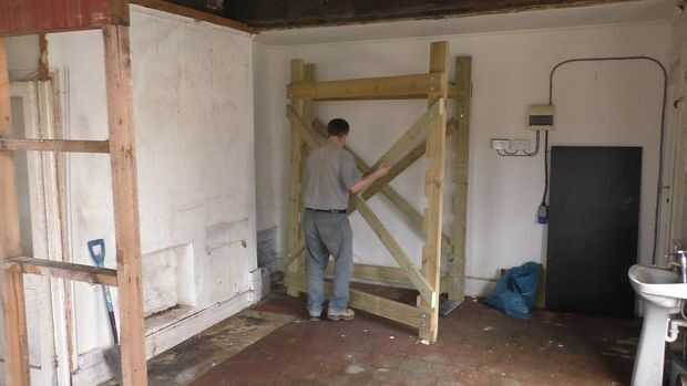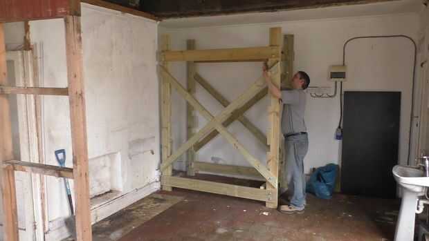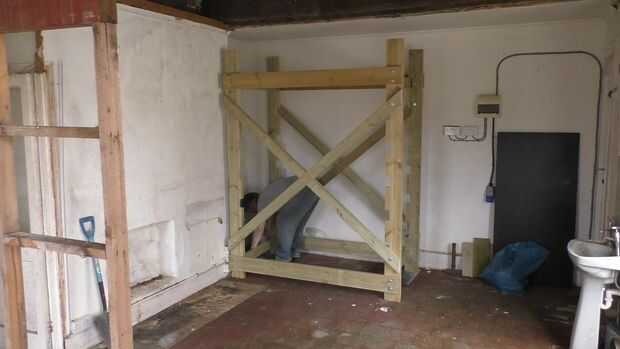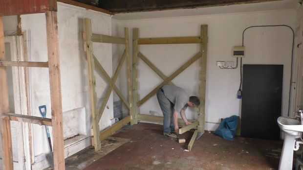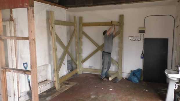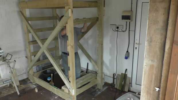 Ahora añadir algún rincón que apoya en la base de la torre. Como de costumbre fui a la ciudad y algunos de los cortes de 50 × 150 había utilizado para el refuerzo. La razón para tal refuerzo de esquina grande se convertirá en claro más adelante, pero cada pieza estaba equipado con cuatro tornillos largos 6x150mm.