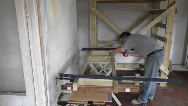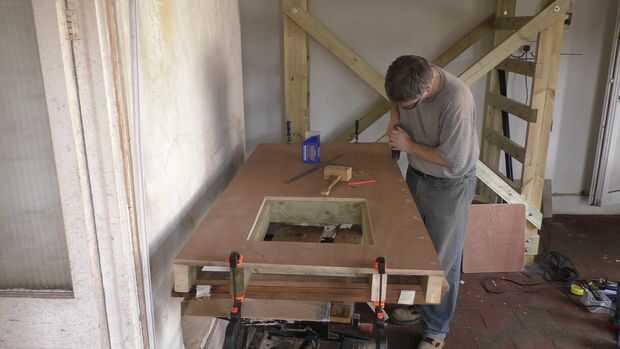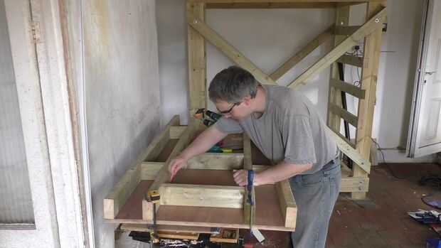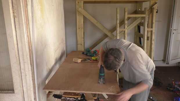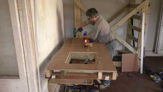 Tomar la hoja de la mesa de trabajo y vuelva a poner el marco y fijar la hoja en la parte superior. Uniformemente los agujeros de espacio sobre cada 250mm la hoja y taladran y atornillar al marco, tornillos de 4,5 x 50 mm funcionan bien.