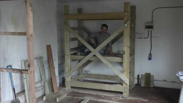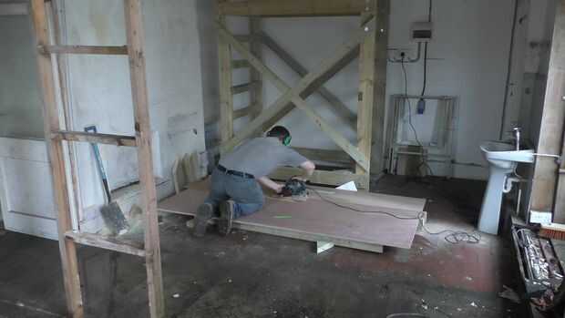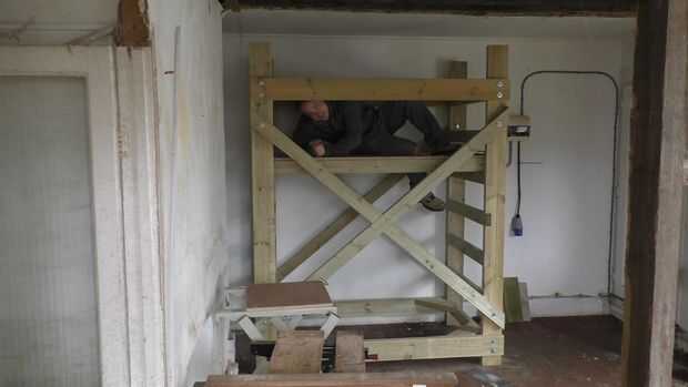 La plataforma está ahora completa. Con la ayuda de un asistente Deslice la plataforma en su lugar. Cuidar en esta fase, la plataforma tiene que ser deslizada en el andamio. Si hay cualquier desalineamiento a mermelada y cosas rápidamente pueden comenzar a ir mal.