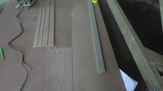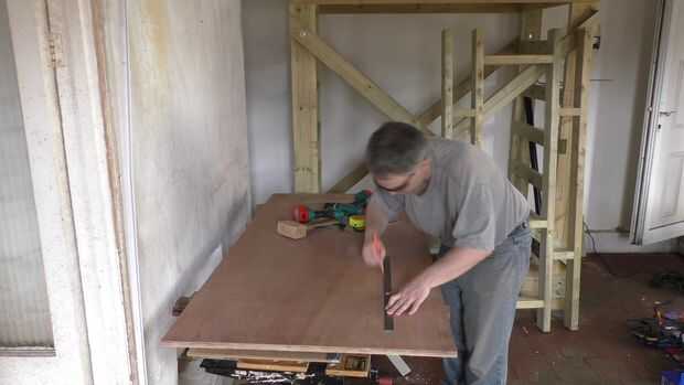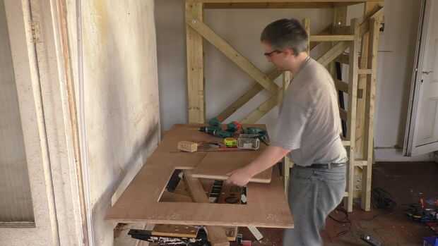 Con la torre completa básicamente es hora de construir la plataforma. Coloque una hoja completa de capas de madera de 18mm en el piso y con una sierra de pista corta el borde largo de la plataforma. Mueva los soportes debajo del capas y cortar a la plataforma. En este punto probablemente se verá un poco pequeña, pero confianza me es bastante más grande.