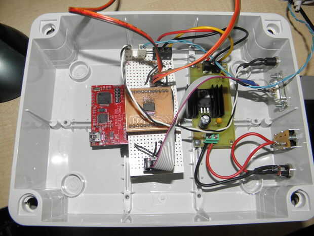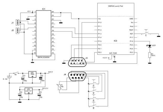 De la placa principal usé MSP430 LaunchPad con microcontrolador MSP430G2553. LaunchPad tienen opción para fuente de alimentación externa (3.3 V). La fuente de alimentación es construir con 7805 y LM1117. Porque servos no trabajan a 3.3 V cuando prueba, uso 5 V para servos. Servos no dio vuelta durante la prueba así que tuve que poner en el desplazador del nivel. Hace un tiempo hice junta con SN74LVC4245a así que utilizado en este proyecto para que el cambio de nivel. Usé el mini joystick y potenciómetro para el control de velocidad de posición y servos.