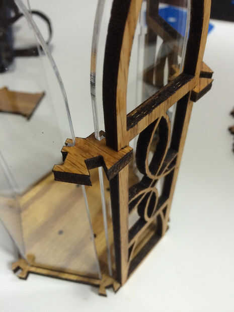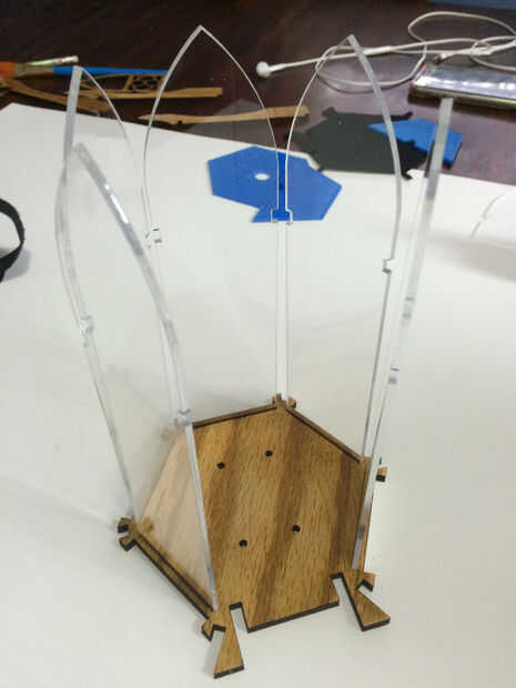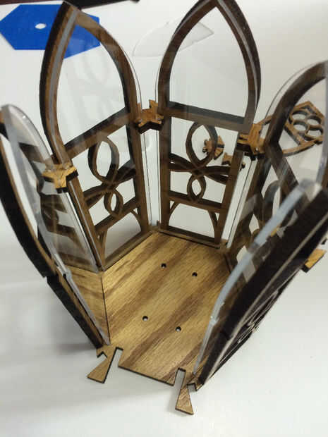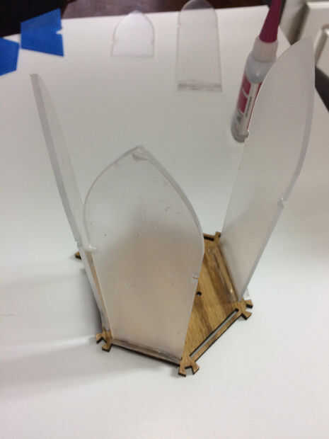 Empezar con la placa de base grande y los cristales de la ventana de plexiglás. Deslice suavemente los cristales en las ranuras de la base. Mantenga la parte inferior a ras y limar los bordes de la base que impiden que el plexi sentado correctamente.