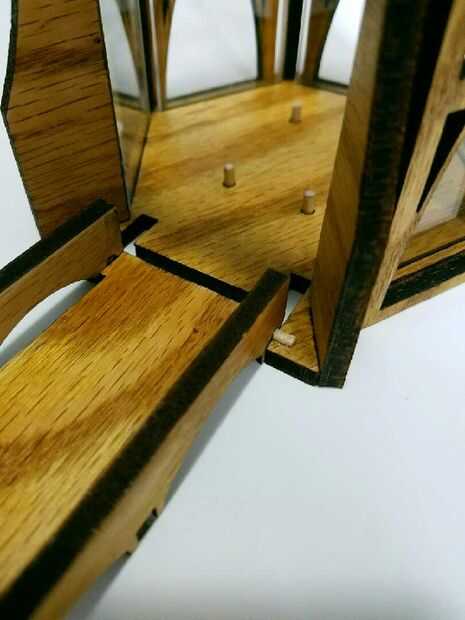 Tomar el puente levadizo y el cuarto dos pernos de corte. Inserte las clavijas en los agujeros del puente levadizo. Puede que necesite hacer alguna presentación ligera para obtener las caras de la cara de corte de cuarto y externa del puente levadizo a nivelarse.
